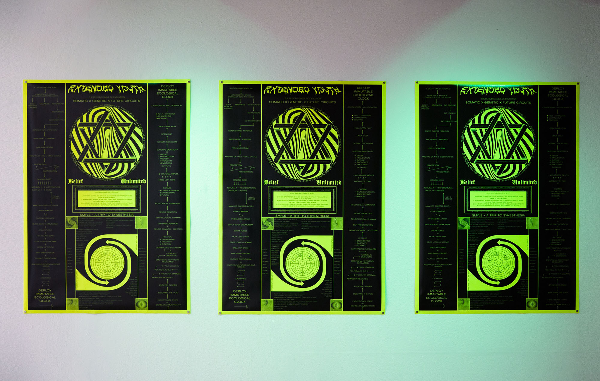 Extended Youth - An Immutable Clockface derives from a concept known as bornless immortality. This concept is a mash-up of ideas from Omsk Social Club’s present-day conditioning, the internet-at-large, endless post-political conversations and the words of Timothy Leary, Simone Weil, Alister Crowley, Discordianism and Immanuel Velikovsky. The piece traverses inside an infinite loop of death, reincarnation, hard left and right forks only to begin again in a state of cryptomnesia - the clock that never stops.